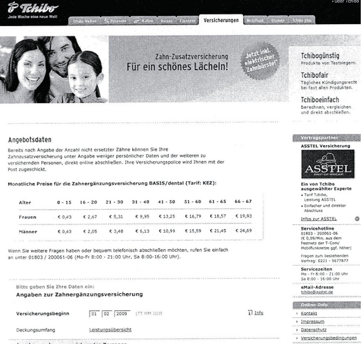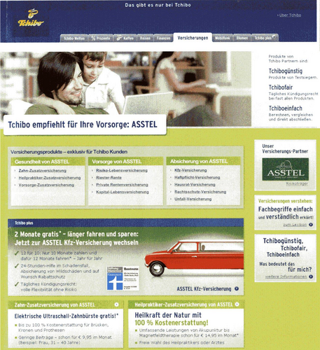 Am rechten Bildrand wurde groß darauf hingewiesen, dass Vertragspartner nicht Tchibo ist, sondern die namentlich genannte Versicherung ASSTEL.